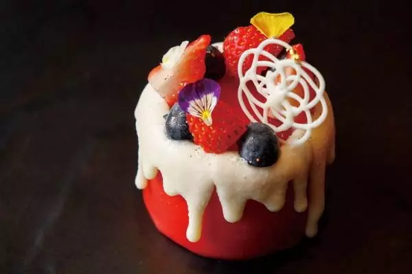 軽井沢プリンスホテル ウエストでは、サクサク食感のフィヤンティーヌをホワイトチョコレートのムースや苺のムースで包み込んだ「ストロベリークオーツ」を用意。トップには、カットしたフレッシュ苺やブルーベリーのほか、エディブルフラワーと金箔をのせ、華やかなルックスに仕上げた。