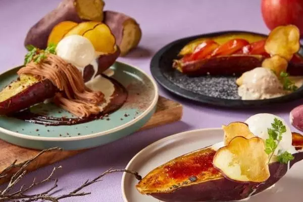 メニューは、パリパリに焼きあげた焼き芋ブリュレの表面からレアチーズがとろけだす「チーズ×濃密お芋ブリュレ」、北海道バターの香り立つりんごコンポートと焼き芋、チーズ、塩キャラメルアイスクリームの調和を楽しむ「チーズ×お芋キャラメルりんご」、焼き芋の上から“お芋ペースト”とチョコレートソースを合わせたクリームをたっぷりと絞った「チーズ×お芋チョコモンブラン」の3種がラインナップ。