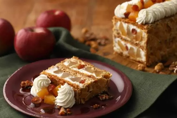 キハチの定番スイーツ「ナポレオンパイ」をリンゴと木の実を使ってアレンジ。サクサクに焼き上げたパイ生地に、カラメル林檎と香ばしくキャラメリゼしたナッツをコンビネーションさせて、香り豊かに仕上げている。