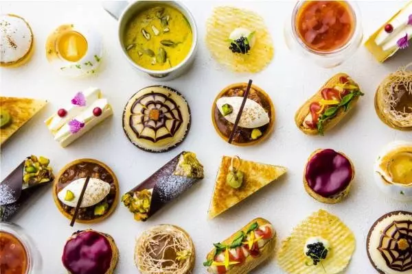 セイボリーは、京都産南瓜を使ったスープや、シュー生地で包んだフォアグラムースのホットドッグ、トリュフとグリュイエールを使用したグリルチーズサンドウィッチなどカラフルな見た目の計5品が揃う。