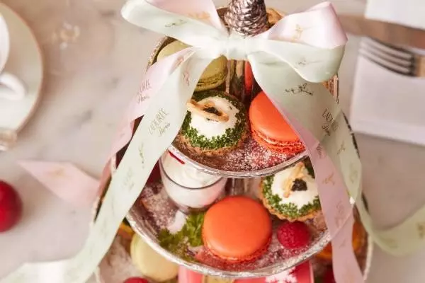 ラデュレのクリスマスアフタヌーンティーは、イルミネーションが輝くクリスマスの街並みのように華やかな仕上がり。クリスマスカラーに彩られたリンゴ&ピスタチオフレーバーのマカロンや、ビュッシュ・ド・ノエルを1名サイズにしたケーキ“ビュシェット”などを味わうことができる。