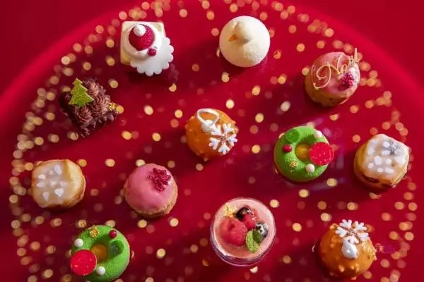 ホテルの外観を約300分の1スケールの黒いアクリルボックスで再現したティースタンドに並ぶのは、サンタクロースやスノーマン、クリスマスオーナメントを模ったキュートなスイーツ。ピスタチオクリームと苺を組み合わせたケーキや、チーズのムース、スパイスや赤ワインがアクセントになったサヴァランなど、高級ホテルならではの上品な味わいのデザートが揃う。