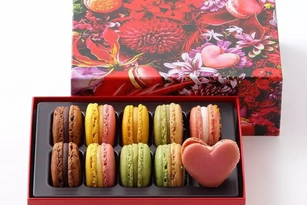 カラフルなボックスは、個数やアソートに応じて4種類のアレンジメントデザインがラインナップ。レッドを基調とした10個詰め合わせやオレンジカラーの15個詰め合わせには、ショコラ、ピスタチオ、レモンといったフレーバーのマカロンや、"ハート型マカロン"も入っている。