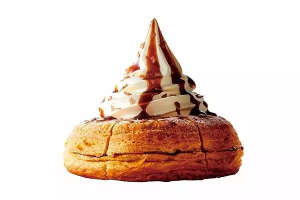 デニッシュパンの間には、深く焙煎したエスプレッソを想起させるコーヒーシロップを染み込ませ、ひんやり冷たいソフトクリームを組み合わせ。さらにソフトクリームの上から、サクサクのフィアンティーヌをトッピングして、食感のアクセントも加えている。