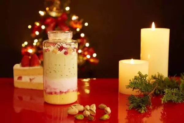 トップには、チョコレートやラズベリー、サクサク食感のクルトンをトッピング。ピスタチオホイップのグリーンやいちごソースのレッドといった鮮やかなカラーを散りばめて、クリスマスケーキを彷彿とさせるビジュアルに仕上げた。