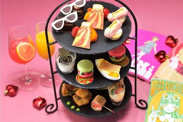 1960年代の英国ファッションを題材にした書籍『60sUKSTYLE』の著者であり、英国フリークの漫画家・イラストレーターの竹内絢香とのコラボレーションによって実現した「60sUKSTYLE Afternoon Tea」では、60年代当時に流行した個性的で刺激的なアイテムや、ヴィヴィッドなカラーから着想を得たスイーツなどが勢揃い。