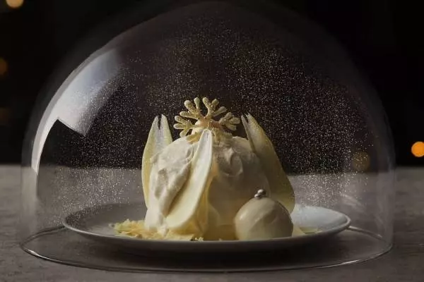 とろける口どけのスフレパンケーキを優しく包み込むのは、リッチで軽い口当たりのミルククリーム。中には甘酸っぱいいちごとベリーコンフィチュール、フランボワーズムースを忍ばせ、仕上げにホワイトチョコレートのパーツで装飾。雪化粧したパンケーキの中にベリーのサプライズが詰まった、クリスマスにふさわしいロマンティックな一皿となっている。