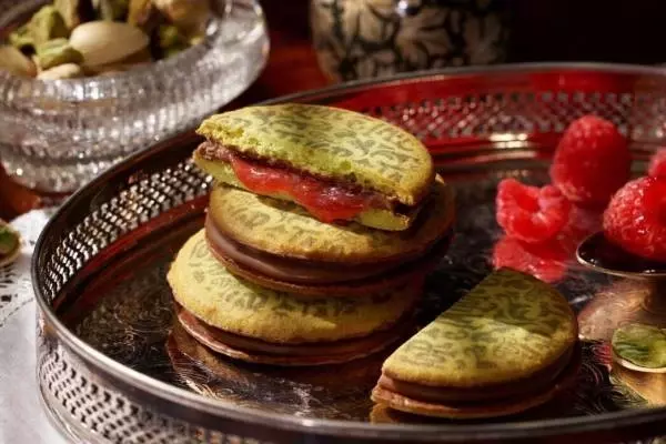 しっとりとした食感に焼き上げたピスタチオクッキーにサンドするのは、ミルクチョコレートでコーティングしたラズベリーソース。濃厚な旨味を閉じ込めたピスタチオクッキーと爽やかな酸味が効いたラズベリーソース、その絶妙なハーモニーが楽しめる一品となっている。