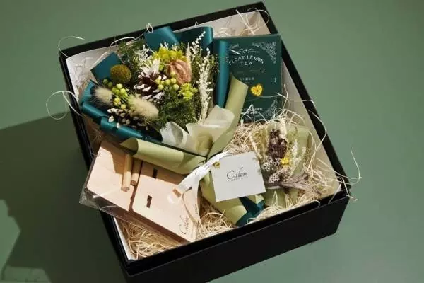 中には、テーマに合わせてデザインされた「ドライフラワーの花束」を主役に、花束をそのまま飾ることができる花束スタンド、クリスマス気分を盛り上げてくれるボタニカルキャンドル、そして本格的なレモンティーをセット。
