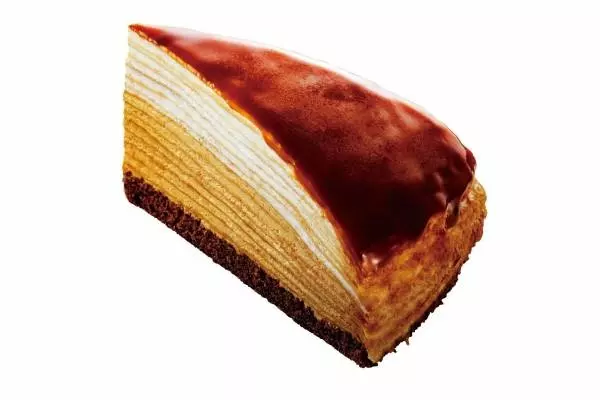 中京エリアのコメダ珈琲店で数量限定発売されるのは、2種のミルクレープ。「塩キャラメルミルクレープ」は、キャラメルクリームと塩クリームを2層仕立てにしたケーキ。ココアスポンジに、キャラメルクリーム、塩クリーム、キャラメルのグラサージュを重ねた。