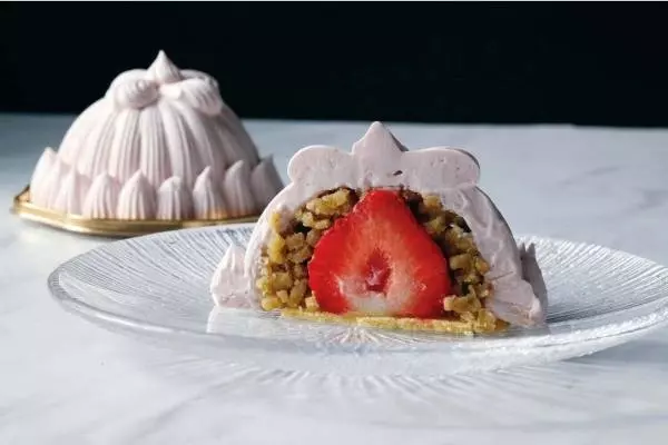 東京會舘の名物スイーツ「マロンシャンテリー」は、東京會舘初代製菓長 勝目清鷹が考案した、70年ほどの歴史を持つモンブラン。今回は、大粒の福岡県産「あまおう」と茨城県産和栗を、苺味の生クリームで包んだ特別なマロンシャンテリーを展開する。みずみずしい苺と上品な甘みの和栗、口当たりなめらかな生クリームのマリアージュを楽しめる贅沢な一品だ。