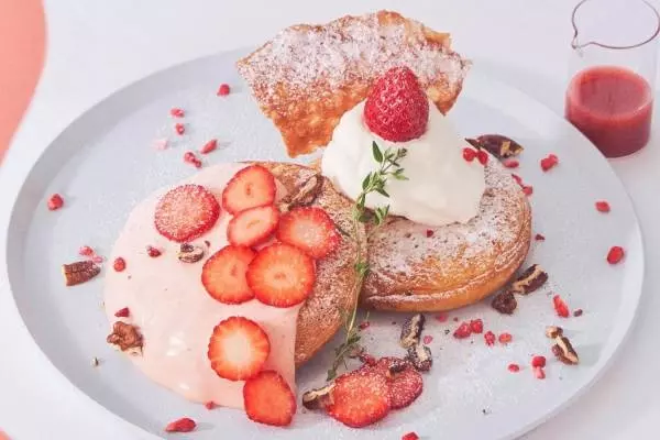 数あるメニューの中でも特に注目したいのは、バタークリームパンケーキとショートケーキ風の2種類のパンケーキが楽しめる「“あすかルビー”の2種パンケーキ 発酵いちごバタークリームパンケーキとショートケーキパンケーキ」。産地直送の「あすかルビー」のフレッシュな果実と甘酸っぱいソース、そして香り高いシナモンの相乗効果で、ワンランク上の味わいが楽しめる。