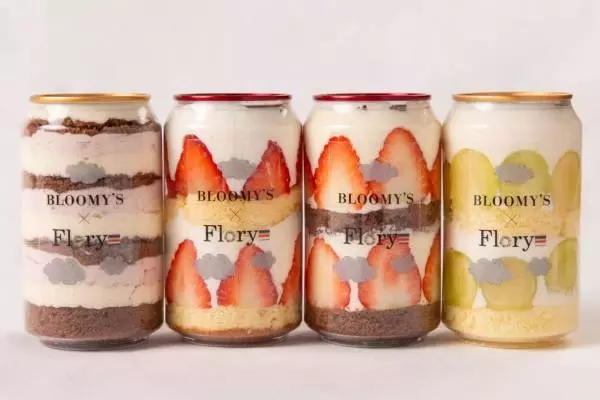 「ショートケーキ缶シュシュ」は、鮮やかな断面が目を引く見た目も楽しいスイーツ。スケルトンの缶に、色とりどりのフルーツやこだわりのクリーム、ふわふわのスポンジを重ねている。