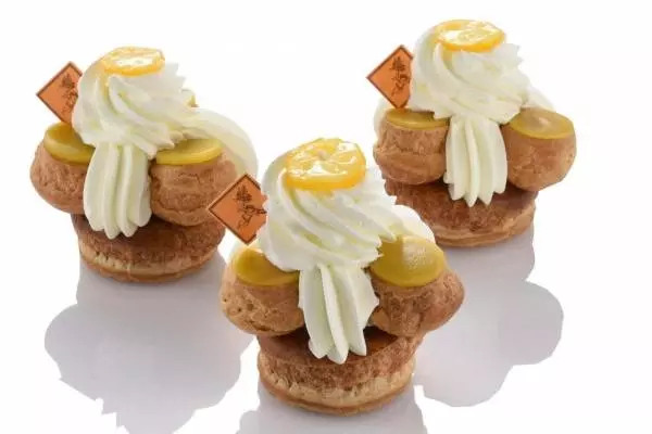 小さなシューを重ねたフランスの伝統菓子「サントノーレ」を"マロン×金柑"でアレンジした「サントノーレ マロン・クンクアット」。サクサクのパイ生地の上に、こっくりとした甘みのマロンクリームをたっぷり詰めたシューを重ね、マスカルポーネ入りのクリームでデコレーションをした。爽やかな酸味の金柑ジュレがアクセントに。トップには、金柑のスライスを飾り、新年にぴったりの華やかな見た目に仕上げた。