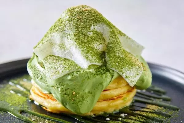 今回J.S. パンケーキ カフェより登場する「西尾抹茶のいちご大福パンケーキ」は、その名の通り“抹茶”と“いちご大福”の要素を掛け合わせたパンケーキ。バター香るもっちりふわふわのパンケーキに抹茶のマスカルポーネやパウダー、“いちご大福”を模したトッピングを乗せたユニークな一品だ。