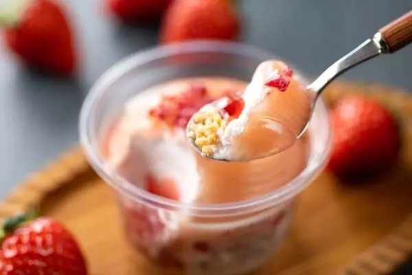 底面には、クッキークランチを敷き詰め、ミルク感がマッチしたいちごミルクアイスといちごピューレを配合した甘酸っぱいいちごあんを層状に重ねている。いちごミルクアイスの中にはフレッシュ感のあるいちごソースを忍ばせた。ひとくち食べるごとに異なるいちごの美味しさに出会える一品だ。