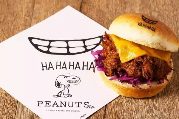 注目は、スヌーピーの"ニヤリと笑う口元"をデザインしたハンバーガー「HAHAHAHA!! HAMBURGER」。アメリカ生まれのバーベキュー料理である"プルドポーク"と、とろっとしたチーズをふわふわのバンズで挟んだ。カリッとした食感のオニオンリングをのせたサラダとクリーミーなクラムチャウダーを添えて提供する。