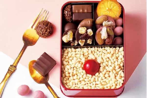 中でも注目したいのは、初登場ブランド・レイカカオが展開する「カカオ弁当」だ。ライスパフとボンボンショコラで“ごはんと梅干し”を表現し、さらにナッツやドライフルーツをチョコレートにのせたマンディアンや、本格的なボンボンショコラを詰め合わせた。