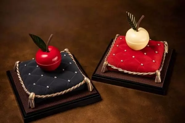 "リンゴモチーフ"のチョコレートをベルベットクッションにのせて