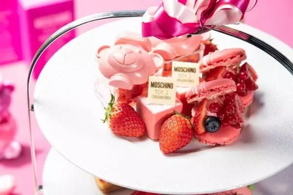 今回は、この「モスキーノ・トイ2 バブルガム オーデトワレ」を着想源に、いちごのアフタヌーンティーを企画。フレグランスの香りやボトルデザインのエッセンスをスイーツに落とし込み、見て食べてハッピーになれる限定メニューを提案する。