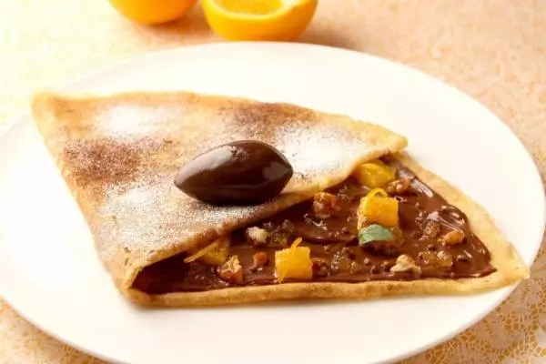 卵、牛乳、小麦粉を主材料にバターの香りを残したクレープ生地を焼き上げ、ヘーゼルナッツが香るたっぷりのチョコレートクリームと、相性の良いオレンジをトッピング。仕上げにカカオの風味豊かなカカオソルベを添えた、濃厚な味わいのクレープだ。