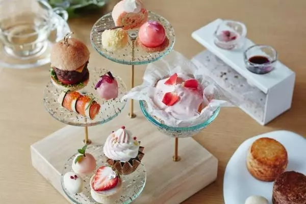 アフタヌーンティーでは、京都産苺「章姫」を使用した苺のタルトや、 軽い口当たりの桜クリームにぶぶあられをあしらった蓬のカップケーキなど、味わいも見た目も春らしいスイーツが勢揃い。ラズベリーとローズのパルフェグラスや、桜とピスタチオのロールケーキなど、華やかな彩りのスイーツが並ぶ。