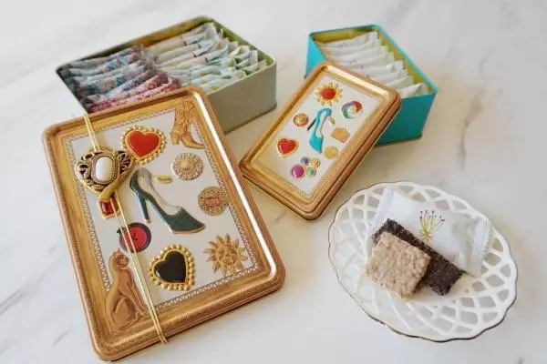 ハイヒールや世界のヴィンテージボタンをデザインした「ジュエルボタン缶」は、青山デカーボから。中には、クランベリーやオレンジピール風味のショコラを詰め合わせた。