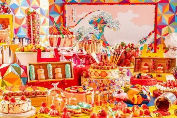 ヒルトン東京1F マーブルラウンジは、「ネオホクサイ」をテーマに、2022年いちごスイーツビュッフェ第2弾を実施。“江戸時代の浮世絵師、葛飾北斎が現代にアトリエを構えたら?”をコンセプトに、カラフルとカオス、デジタルとアナログをミックスさせたおしゃれな空間を演出する。