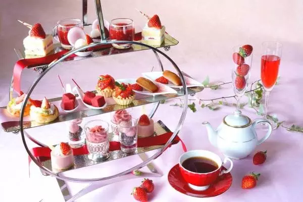 スタンドには、苺を使ったソルベ、ショートケーキ、チョコレート、ムース、タルト、フィナンシェなどバラエティ豊かなスイーツが勢揃い。ドリンクにも「いちごの紅茶」やベリーローズティーなどが登場し、苺好きには堪らないメニューが揃う。
