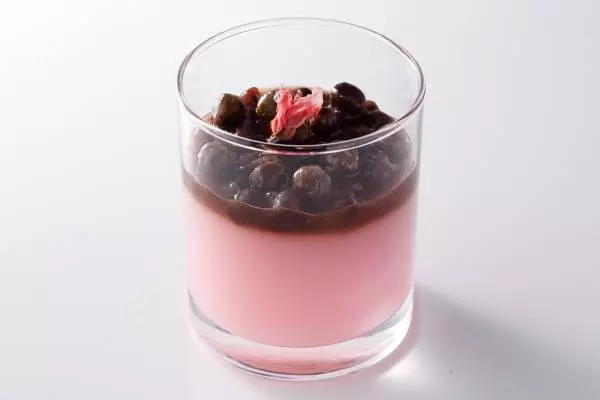 2種類の寒天を入れた「さくら寒天」は、桜を彷彿とさせるピンクカラーが可愛らしい。5日間じっくりと煮込んだ丹波産の黒豆や優しい甘さの自家製黒蜜あんこ、塩えんどう豆を加えることで、異なる食感と味わいをプラスしている。
