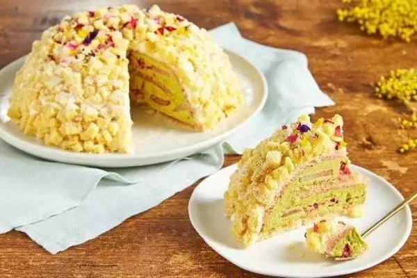 スタバ手掛ける「プリンチ」のミモザケーキ、“ピスタチオや苺入り”で華やかにアップデート