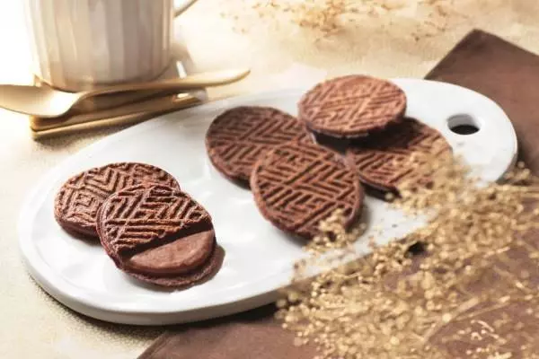 さくさく食感のチョコレートワッフル生地をベースに、ビターなチョコレートクリームをサンドした。ワッフルの軽い食感と、ほろ苦いチョコレートの味わいが絶妙にマッチした1品となっている。