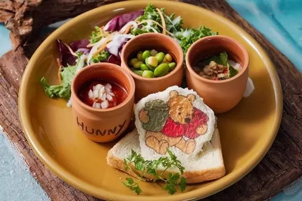 「<プーさん>ハニーポットのデリプレート」は、はちみつを守るプーさんの愛らしい姿がポイント。プーさんのイラスト入りパンに、HUNNYのロゴ入りポットに入ったサラダやミートボールなどのデリを合わせて、ご馳走プレートを仕上げた。