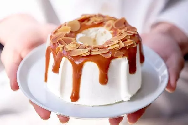 看板メニューは、パティシエがオールハンドメイドで作る「生キャラメルシフォンケーキ」。米粉と卵白を使った淡い色合いのシフォンケーキは、しっかりと水分をたたえた絹のような“ふわもち”食感が特徴。これを甘さ控えめのミルキーな生クリームで包み込み、仕上げにほろ苦いキャラメルソースを天面から滴らせれば、人気No.1シフォンケーキの完成だ。