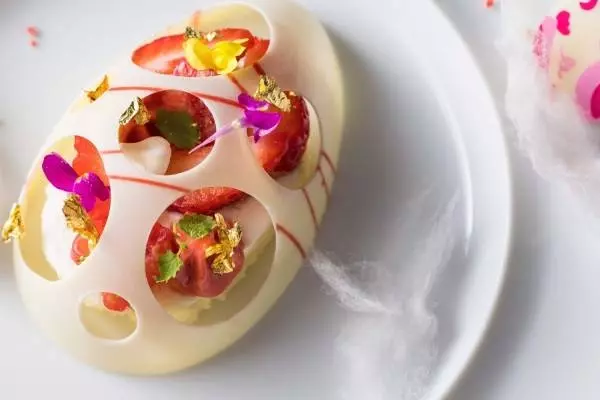ラ ターブル ドゥ ジョエル・ロブションでは、イースターエッグに見立てたチョコレートの中に、フルーツやソルベを忍ばせた「イースターエッグに見立てたクレームダンジュに旬の苺をあしらって」を展開。ベリーのソースをかけると、中から苺のソルベやフレッシュなカットフルーツが現れる、華やかな仕上がりだ。
