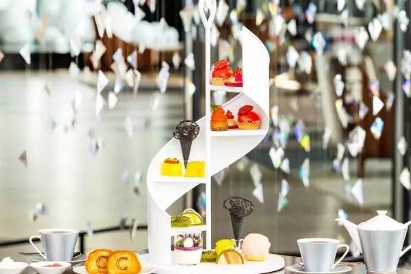 コンラッド大阪の新作のアフタヌーンティーは、ジューシーな桃を主役に、アプリコットやオレンジ、ラズベリーなどのフルーツと組み合わせた色とりどりのスイーツを展開。真っ白な“螺旋階段”を模した美しいティースタンドに並べ提供する。
