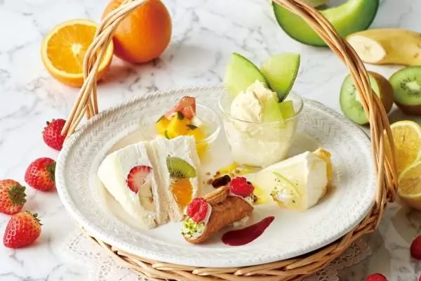 愛らしい籠プレートの中には、7種の果物を使用したこだわりスイーツをセット。アンデスメロンになめらかな杏仁ゼリーとレモンジュレを合わせた“パフェ仕立て”の「メロンと杏仁のパフェ」や、甘さ控えめのホイップと果物を挟んだ「フルーツサンド」などがラインナップする。