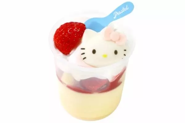 パステルオリジナルのなめらかなミニプリンには、ホイップクリームをのせ、ココアパウダーで「ハローキティ」のイラストをあしらい、愛らしく仕上げた。尚、5月と6月で、描かれる「ハローキティ」のデザインが変わる点にも注目だ。