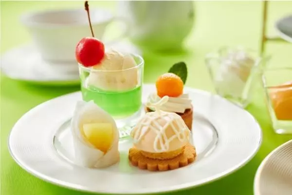 ホテル日航大阪“メロン尽くし”アフタヌーンティー、フレッシュメロン求肥包み&メロン型ムース