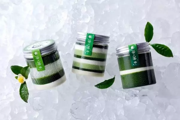『夏茶の菓「茶」』は、香り高いお濃茶とミルク感あふれるまろやかな「茶の菓」の味わいをジュレで表現。お濃茶を使用したパンナコッタやゼリー、ソースを重ね、ミルキーなホワイトチョコレートのガナッシュと生クリームたっぷりのパンナコッタも加えている。