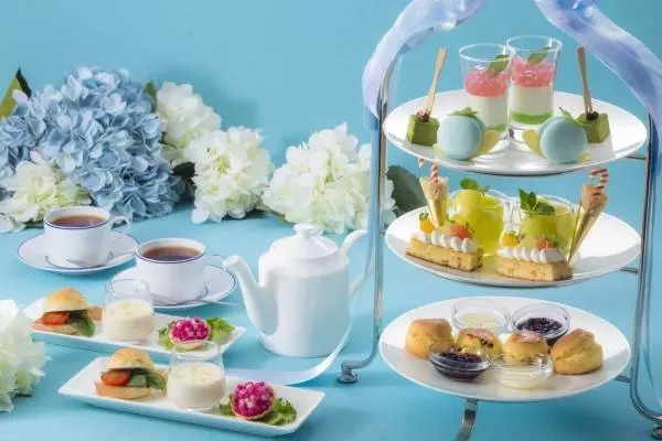 神戸ポートピアホテルの最新アフタヌーンティーは“雨”がモチーフ。梅雨の晴れ間のきらきらとした陽射しに着想を得て、紫陽花やカタツムリ、傘などをイメージした、見た目にも華やかなスイーツを取り揃えた。