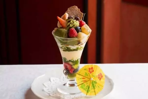 爽やかなお茶のシャーベットとアイスクリーム、伝統のバニラアイスクリームをメインに、きな粉のわらび餅や白玉、フルーツを重ね、食感と彩り豊かな味わいに。パフェグラスの脇には小さな番傘をあしらった、新橋芸者の上品で小粋な佇まいを感じさせる一品となっている。