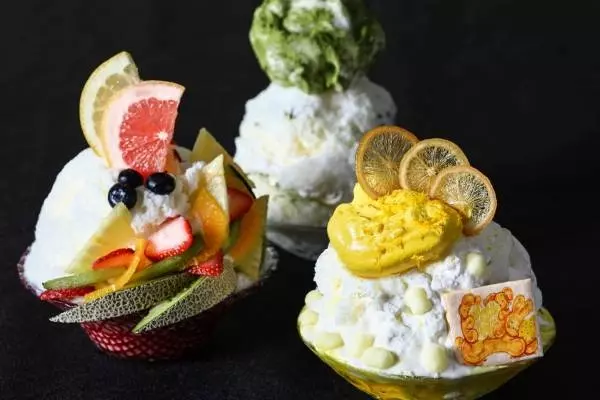 このほか、愛知県西尾産の抹茶特有の深い緑や上品な香り、旨味・コクを様々な仕立てで表現した抹茶づくしの「濃いおまっちゃ氷〜西尾抹茶のシンフォニー〜」、いちごソルベ・ライチジュレ・いちごのグラニテを忍ばせたミルク氷にカッティングフルーツをふんだんにトッピングした「シロクマ氷〜果実のラプソディ〜」を加えた全3種類のかき氷が楽しめる。