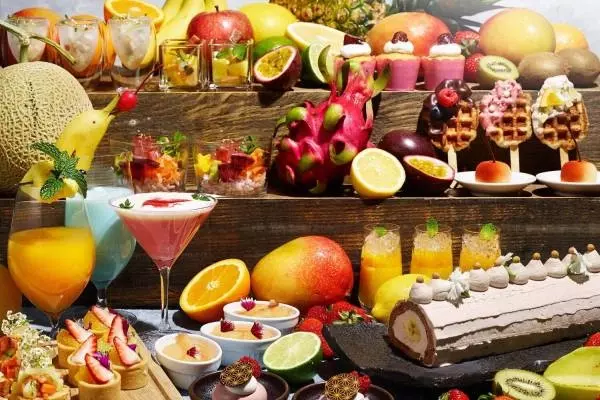 ビュッフェ台には、メロンのショートケーキやマンゴープリン、フルーツタルトなど見た目も華やかなスイーツメニューが勢揃い。フルーツがテーマのノンアルコールカクテルも20種類以上と豊富なラインナップが揃う。