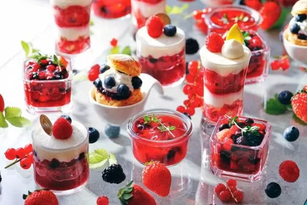 ブッフェ台を彩るのは、人気の苺やラズベリー、酸味豊かなクランベリー、濃厚なカシスといった多彩なベリー。様々なベリーのマリアージュを楽しむ深紅のプディング、酸味の効いたラズベリーとレモンのコンビで爽やかに仕上げたショートケーキ、ブルーベリーと紅茶が香るトライフルなど、それぞれの個性を活かしたグラススイーツがラインナップ。