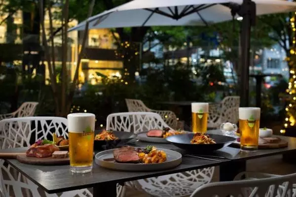 ザ ストリングス 表参道は、1階レストラン「カフェ&ダイニング ゼルコヴァ」にて、テラス席限定の「ビアテラス」を、2階レストラン「タバーン・バイ ザ グリーン」にて、メキシコ料理を中心とした「ビアダイニング”テクス・メクス バーベキュー”」の2種のプランを期間限定で提供する。