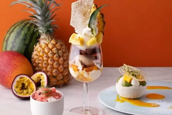 今回は、濃厚な香りとこっくりとした甘さ、そして爽やかな後味が魅力の国産トロピカルフルーツにフィーチャー。パッションフルーツ、マンゴー、スイカ、パイナップルの4種類のフルーツを使ったスイーツをじっくりと堪能出来る。