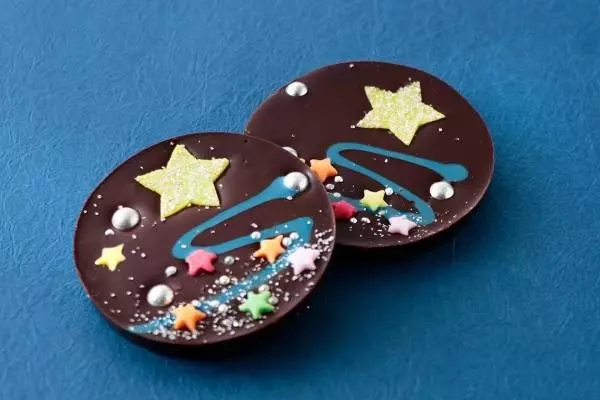 ベルアメールの「パレショコラ」は、テーマごとに素材を厳選し豊富なバリエーションで提供される、直径6cm・厚さ6mmの板チョコレートシリーズ。今回は“ミルキーウェイ”と題して、七夕の夜空をデザインした。オリジナルのビターチョコレートに、青いラインやカラフルな星型でデコレーションを施したロマンティックな一品だ。