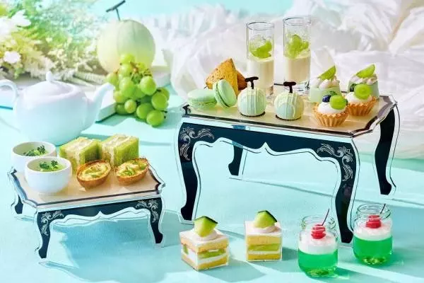 アール・ヌーヴォー風のアフタヌーンティースタンドを彩るのは、メロンとマスカットのグリーンに染まった様々なスイーツ&セイボリー。瑞々しい果実感が楽しめるメロンショートケーキやメロン型のムース、メロンソーダをイメージしたゼリー、シャインマスカットのフロマージュブランなど、多彩なメニューが用意されている。