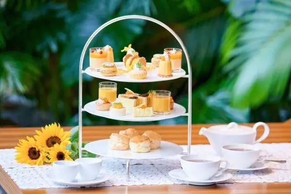 「ブライトサマー エディション アフタヌーンティー」は、桃やマンゴー、アプリコット、パッションフルーツなど、夏に旬を迎えるフルーツをふんだんに使用したアフタヌーンティーだ。夏らしいビタミンカラーを纏った、華やかなスイーツ&セイボリーがティースタンドを彩る。